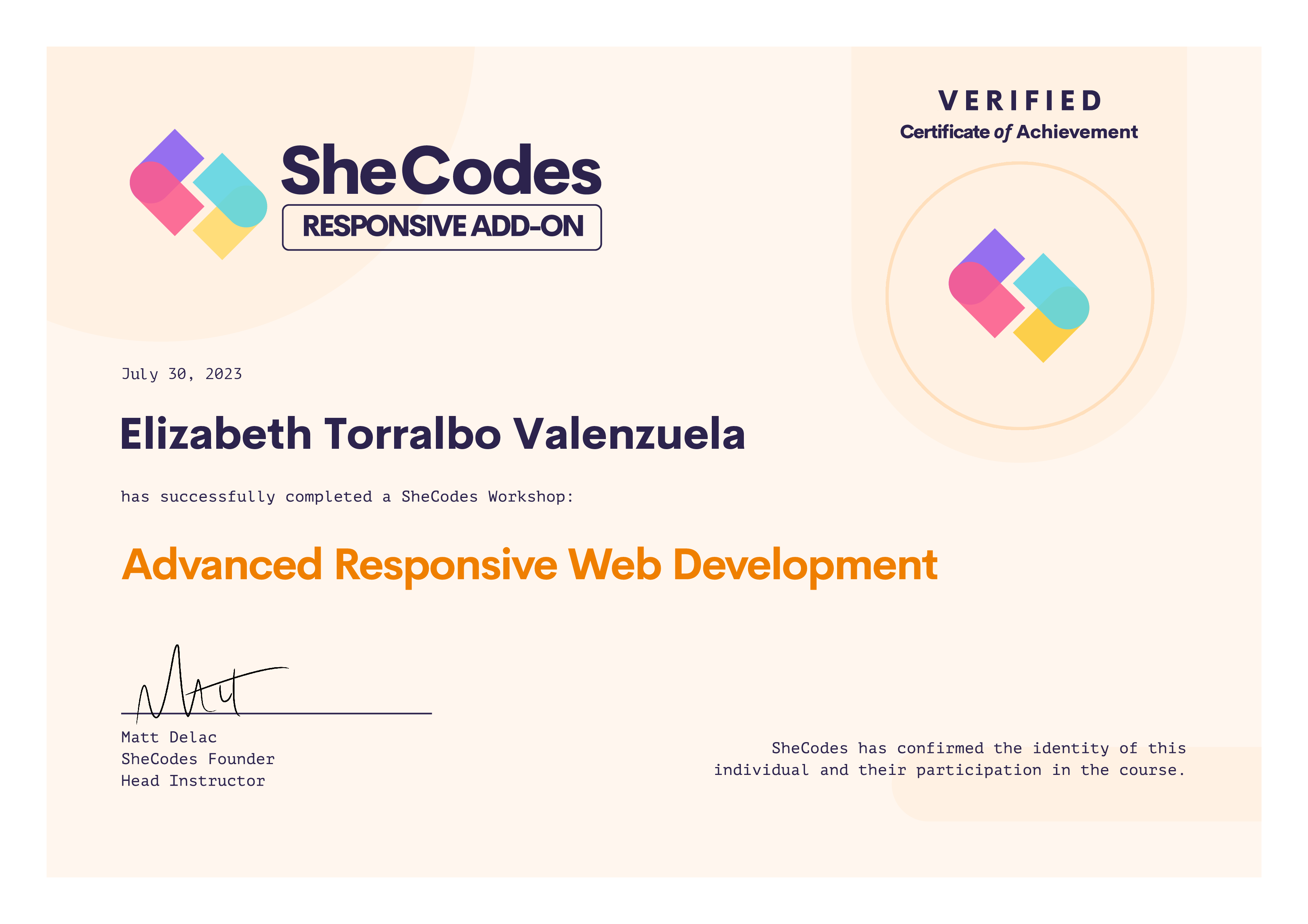 Successfully graduated from SheCodes Basics, SheCodes Basics Add-on, SheCodes Plus, SheCodes Plus Add-on, SheCodes Responsive, SheCodes Responsive Add-on, SheCodes React, SheCodes AI Add-on, SheCodes Python Basics, SheCodes React Add-on, SheCodes Next, SheCodes Python Advanced and is featured in the SheCodes Hall of Fame